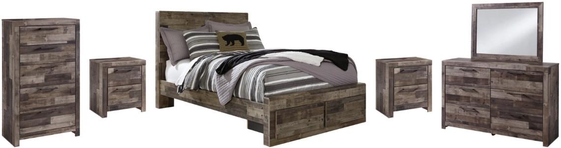 Includes full panel storage bed (headboard, 2-drawer storage footboard, rails and slats), 6-drawer dresser with mirror, 5-drawer chest, and two 2-drawer nightstands
