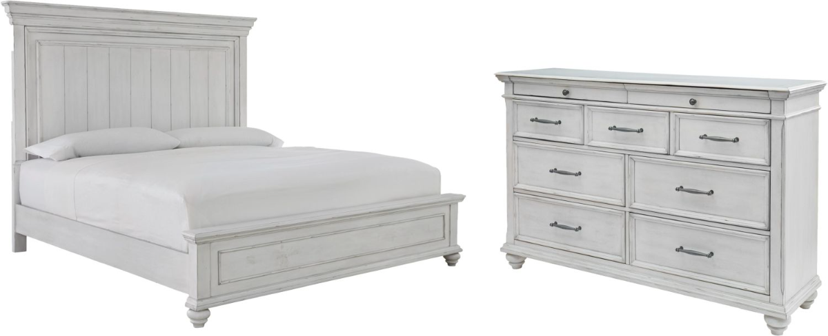 Includes queen panel bed (headboard, footboard and rails) and dresser