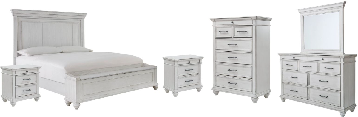 Includes queen panel bed (headboard, storage bench footboard and rails), dresser with mirror, chest and two nightstands