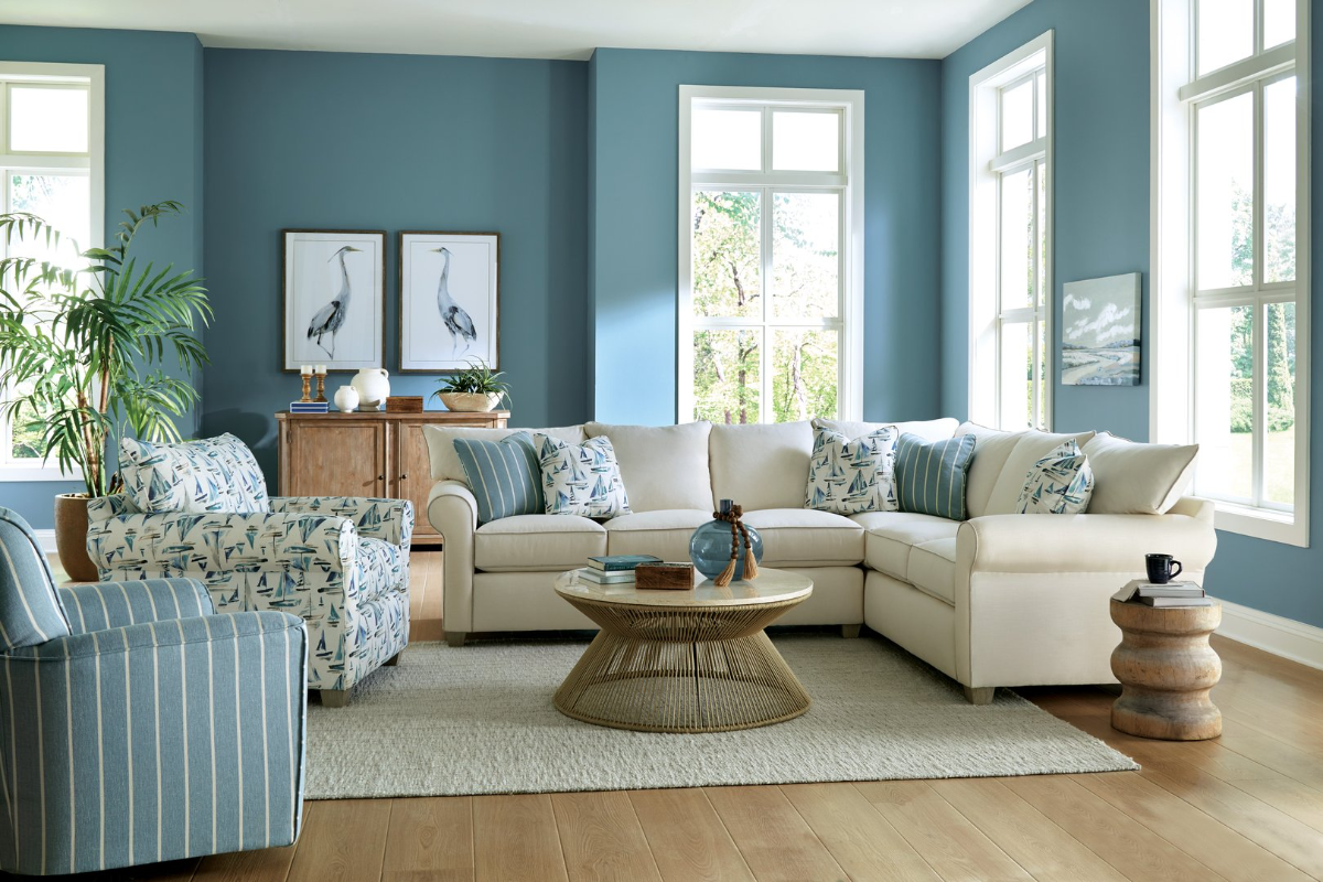 This sectional features loose bed pillow backs and Super Soft Blend Down seat cushions and backs for enhanced comfort, as well as Luxdown toss pillows for a welcoming touch. Sock arms and tapered legs compete the familiar look of this casual and versatile sectional. Also available are the matching 3-seat sofa, 2- seat sofa, bench-seat sofa, loveseat, chair, ottoman, and sleeper sofa. Also available with a removeable slipcover- see style 9364.