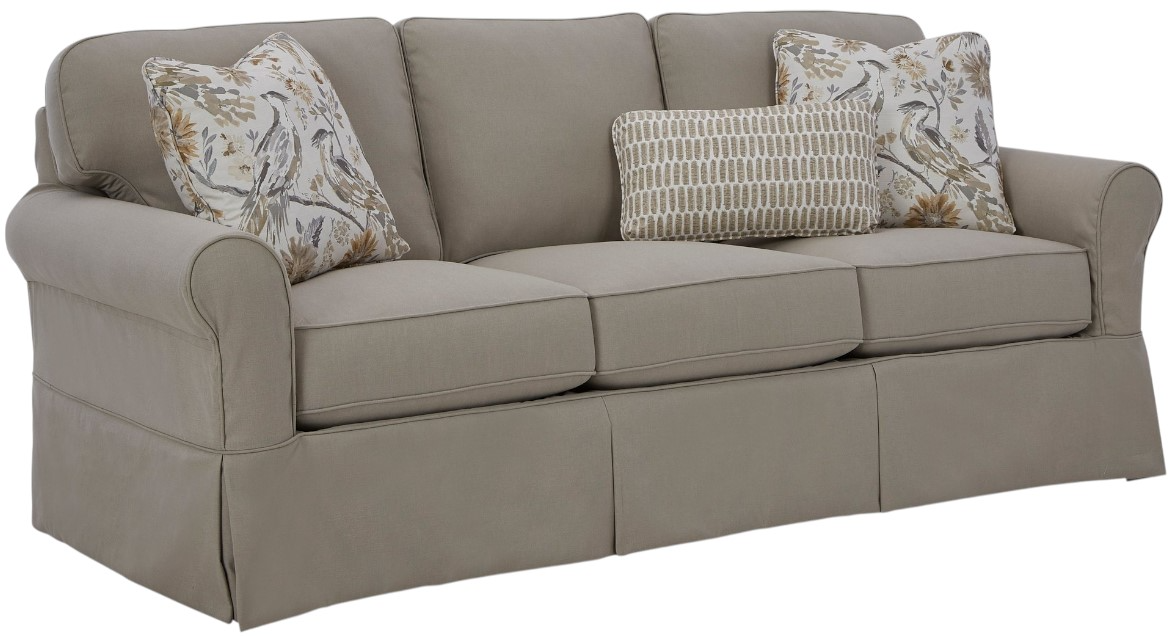 Super Soft seat cushions for extraordinary comfort, as well as two Blend Down toss pillows and one kidney pillow for a welcoming touch. Sock arms and a relaxed waterfall skirt complete the familiar look of this casual and versatile sofa. You will love coming home to this fresh and inviting look.