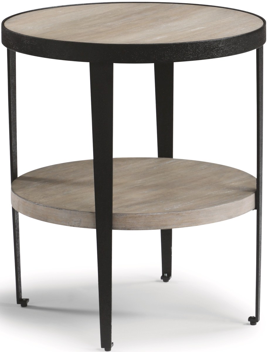 Round design with a striking balance of style and function. Compass brings a rustic focal point to your space with the round, whitewash wood shelves that are set on a textured, gunmetal-finished frame. The chairside table features two round shelves. Compass will bring the eye-catching, rustic element you seek to any room.Read More