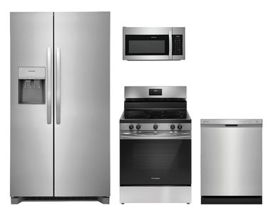 Frigidaire® 3 Piece Stainless Steel Kitchen Package features a side-by-side refrigerator with EvenTemp™ cooling system, freestanding electric range with SpaceWise® dual expandable element, front control dishwasher with MaxDry™, and over the range microwave.Read More