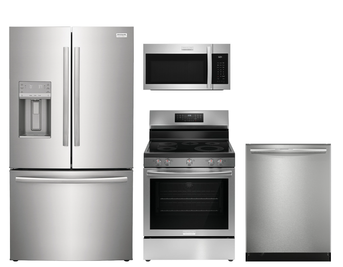 This 4-piece stainless steel kitchen features a french door refrigerator with ice and water dispenser, an electric range with Total Convection that enables more than a dozen cooking modes, built-in top control dishwasher with 3rd rack, and over the range microwave.Read More