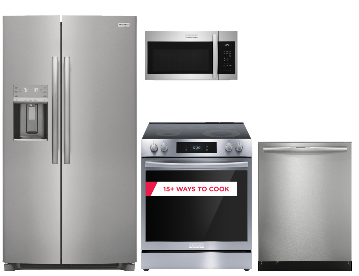 Frigidaire Gallery® 3 Piece Smudge-Proof® Stainless Steel Kitchen Package with a 25.6 cu. ft. side-by-side refrigerator, slide-in electric range with 15+ cook modes, top control dishwasher with MaxBoost Dry™, and over the range microwave with sensor cook.Read More