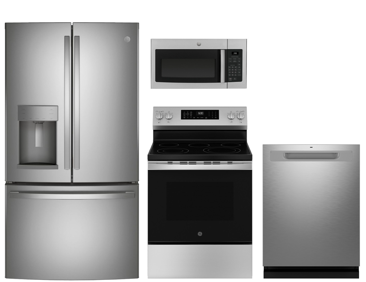 This 4-piece stainless steel kitchen features a french door refrigerator with ice and water dispenser, electric range with Air Fry, built-in top control dishwasher with 3rd rack & over the range microwave with sensor cooking.Read More