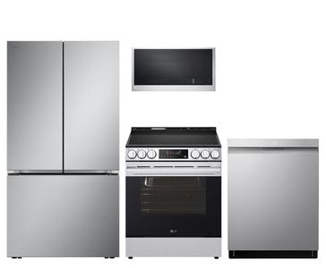 This 4-piece stainless steel LG kitchen package features a 26.5 cu. ft. Counter-Depth MAX™ French Door Refrigerator with ice & water dispenser; a slide-in electric range with Air Fry and ProBake Convection®; a top control dishwasher with TrueSteam® and Dynamic Heat Dry™; and over the range microwave with Sensor Cook.Read More