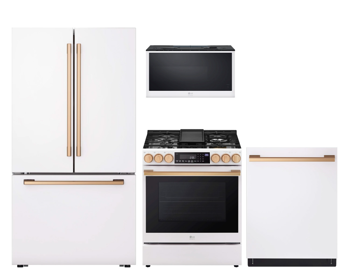 This 4-piece essence white kitchen package from LG Studio features a 26.5 cu. ft. counter depth french door refrigerator, slide-in gas range with Air Fry and Air Sous Vide, built-in dishwasher with 1 Hour Wash & Dry, and over the range microwave with Bake, Roast, and Air Fry.Read More