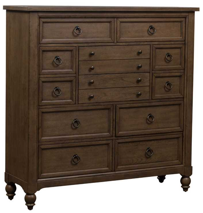 When details matter, choose the Americana Farmhouse 12 Drawer Chesser. Finished in a Dusty Taupe and accented with antique brass drop ring and knob pull hardware. All 12 drawers feature French & English Dovetail construction, wood framing with a beveled edge, and full extension drawer glides.Read More