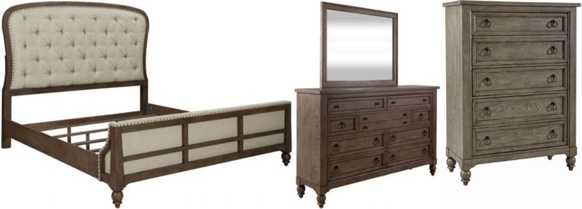 When details matter, choose the Americana Farmhouse king shelter bed, dresser, mirror, and chest. Crafted of poplar solids with white oak veneers, this kit features a wire brushed dusty taupe finish with worm hole distressing, full extension drawers with wood framed drawer fronts, premium felt lined top and cedar lined bottom drawers, turned bun feet, and is accented with antique brass drop ring and knob hardware. The shelter bed features a headboard with a softly shaped solid wood frame with a button tufted upholstered linen panel lined with nail head accents. The shelter footboard has an upholstered panel that wraps over the footboard frame with nail head accents and a deconstructed design that accents the exposed frame. The dresser offers nine drawers of storage with a bluff-cut center drawer for added visual interest. Attach the landscape mirror with its picture frame trim and beveled edge with the included bolt-on supports. The chest offers an additional five drawers of storage. Americana Farmhouse evokes a style unconstrained and intended to be personal with an authentic craftsman’s flair and artistry.