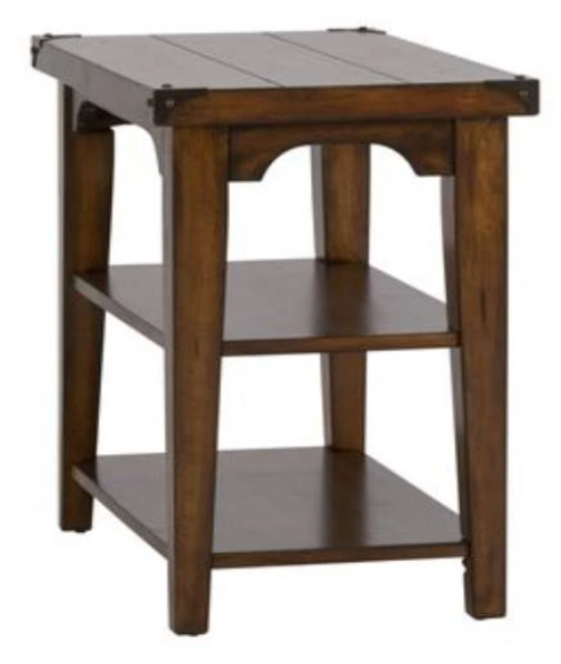 Accent your space with the traditional Aspen Skies chair side table. Crafted of pine solids and New Zealand pine veneers with metal accents, this piece features a russet brown finish, appealing planked top with metal accents and nail heads on each corner, two open design shelves for additional storage, anchored by a tapered leg design.Read More