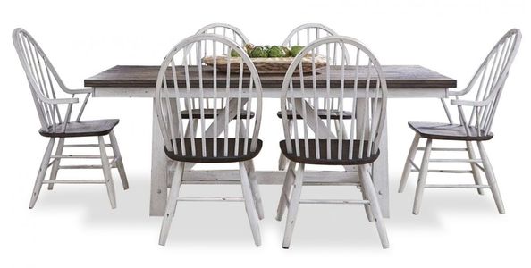 Sitting pretty with the Farmhouse seven-piece trestle table set. Crafted of rubberwood solids and veneers, this kit includes the fixed-top trestle table and six Windsor back side chairs. The trestle table features a timeless heavy distressing with a two-tone white and wood-tone finish with a planked top.Read More