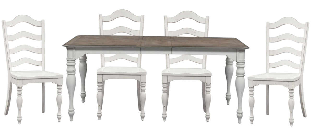 Sitting pretty with the Magnolia Manor five-piece leg table set, consisting of a leg table and four ladder back side chairs. Crafted of poplar solids and white oak birch veneers, this kit features an antique white finish with a weathered brown top with whitewash.Read More