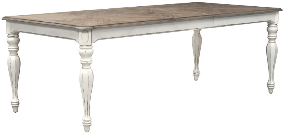 Gather in style with the Magnolia Manor rectangular leg table. This piece features the perfect blend of European design with a weathered brown top accented by whitewash, one 18-inch removable leaf, a fancy face veneer dining top, canted corners, and is anchored by faceted turned legs.Read More