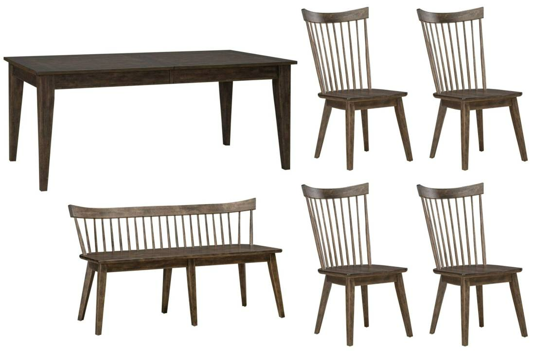 The Midland Falls 6-piece rectangular table set exudes a warmth that invites people to gather around it and share stories, laughter, and meals. This set features a rustic brown finish and includes four spindle-back side chairs, a spindle-back bench, and the rectangular leg table.Read More