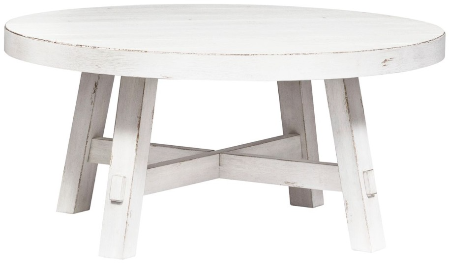 Accent your space with the Modern Farmhouse splay leg round cocktail table. Crafted of poplar solids with knotty white oak veneers, this piece features a dusty flea market white finish with heavy distressing, appealing high-low planked top, anchored by a splayed leg design.Read More