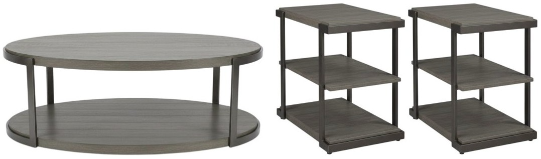 Design possibilities are endless with the Modern View oval cocktail table and two tiered end tables. The cocktail table and end tables feature wire brush distressing, dark pewter metal bases, open shelf design, and casters added to the cocktail table for easy maneuverability. Add this one-of-a-kind kit to your modern styled home.Read More