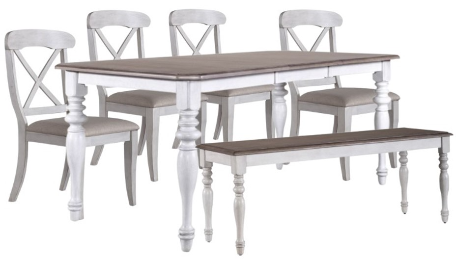 Warm and cozy. Bring beauty indoors with the Ocean Isle six-piece rectangular table set. Crafted of rubberwood solids with New Zealand pine veneers, this set features an antique white and weathered pine finish and consists of four upholstered X back side chairs, a bench, and a rectangular leg table.Read More