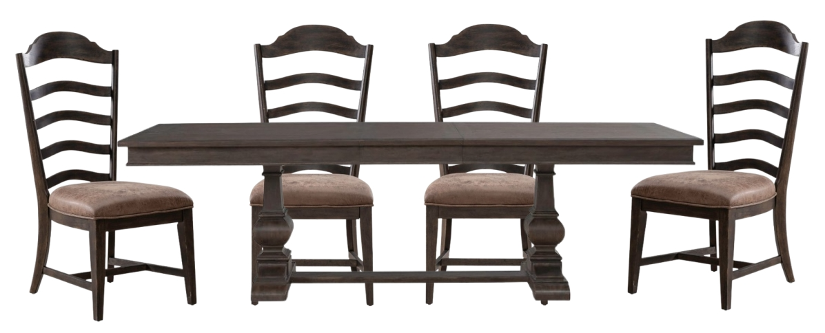 Forget dining out and make your home the best place to enjoy a meal with the Paradise Valley five piece trestle table set. Crafted with excellence using rubberwood solids and split heart white oak veneers, this set features a saddle brown finish and includes the trestle table and four upholstered ladder back side chairs.Read More