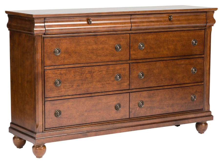 Achieve a casual traditional look with this 8-drawer dresser. The rustic cherry finish is attained through pin knotty cherry and a well-worn look. Organize your clothing using the 6 large drawers and 2 smaller drawers. The Louis Philippe style dresser features chamfered pilasters and bun feet, adding to the casual feel.Read More