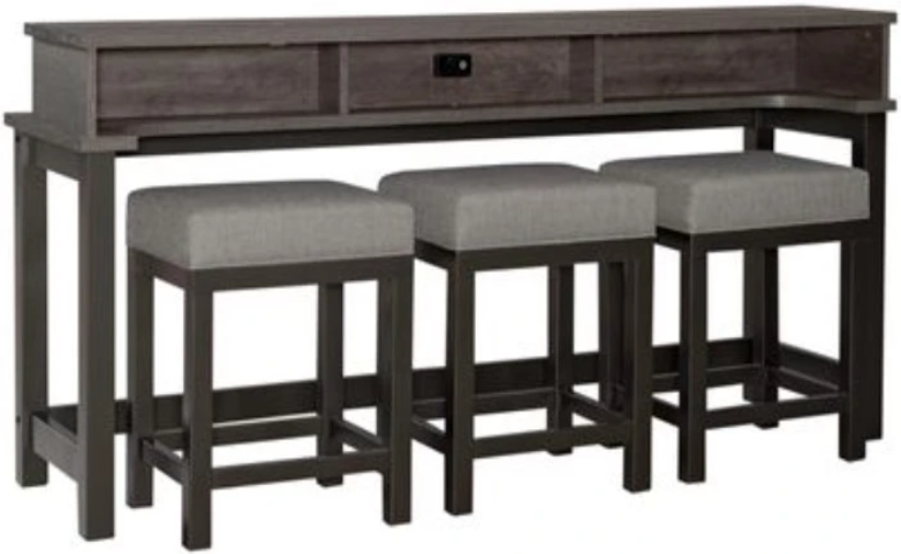 The Tanner Creek is both practical and stylish. Crafted of melamine and a rubberwood solid frame in a Greystone finish. Perfect for behind your sofa or in a kitchen nook. Kit consists of one console bar table and three console stools.Read More