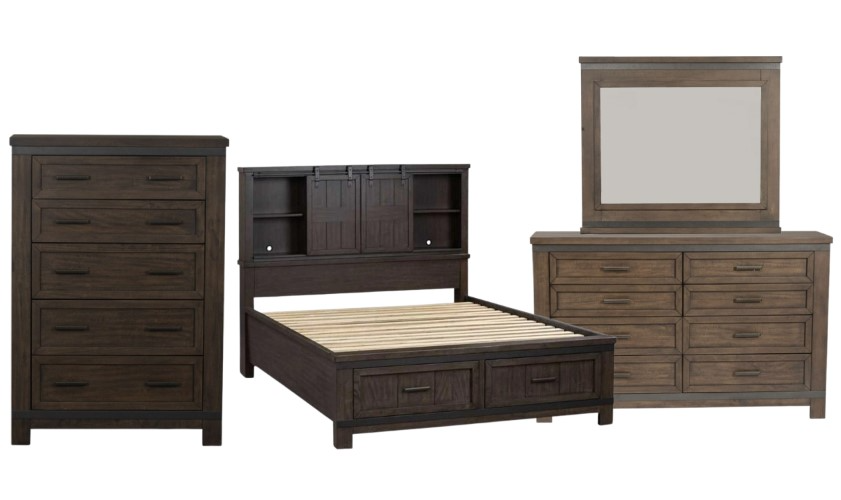 Planked tops and side panels, wood framed drawer fronts, full extension drawers with felt lined top drawers, and is accented with dark antique pewter hammered metal bar pull hardware. This unique bookcase bed features a headboard with adjustable shelving for display and storage with wire management access holes in the back panel and a storage footboard complete with two drawers. The dresser features eight drawers of storage, and pairs well with the wood framed mirror that features a beveled edge. Attach the mirror to the dresser with the included bolt-on supports. The chest offers you an additional five drawers of storage. Add this unique bedroom set to your traditional style home.