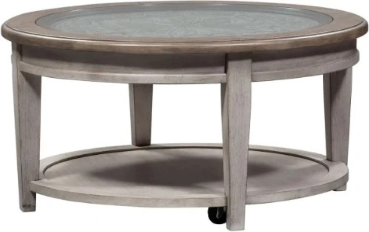 Accent your space with the Heartland round ceiling tile cocktail table. Crafted of rubberwood solids with cathedral white oak veneers, this piece features an antique white finish with a tobacco top, a bottom shelf for additional storage, appealing wood framed glass top with a decorative tile insert, anchored by square tapered legs with casters.Read More