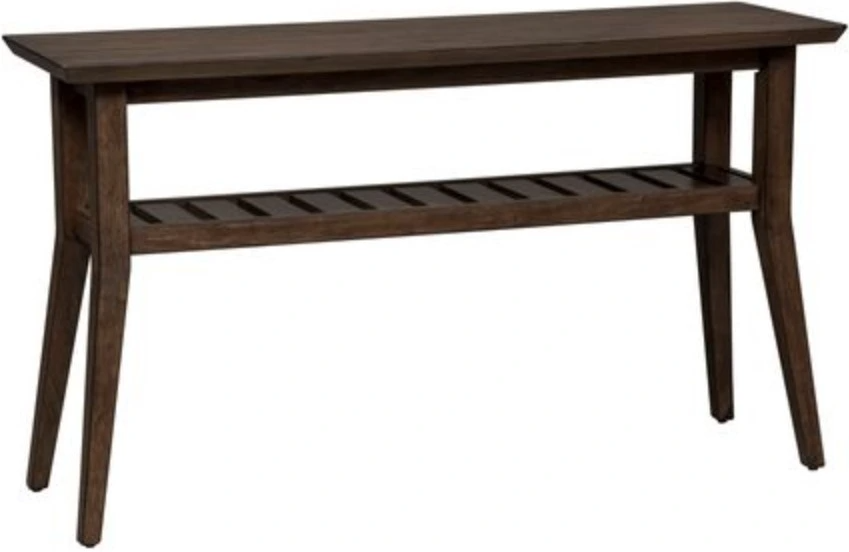 Transform your space with the Ventura Boulevard sofa table. Crafted of rubberwood solids and cathedral walnut veneers, this piece features a bronze spice finish, bottom slat shelf for additional storage, anchored by tapered splayed legs. This contemporary sofa table would be a great addition to any space.Read More