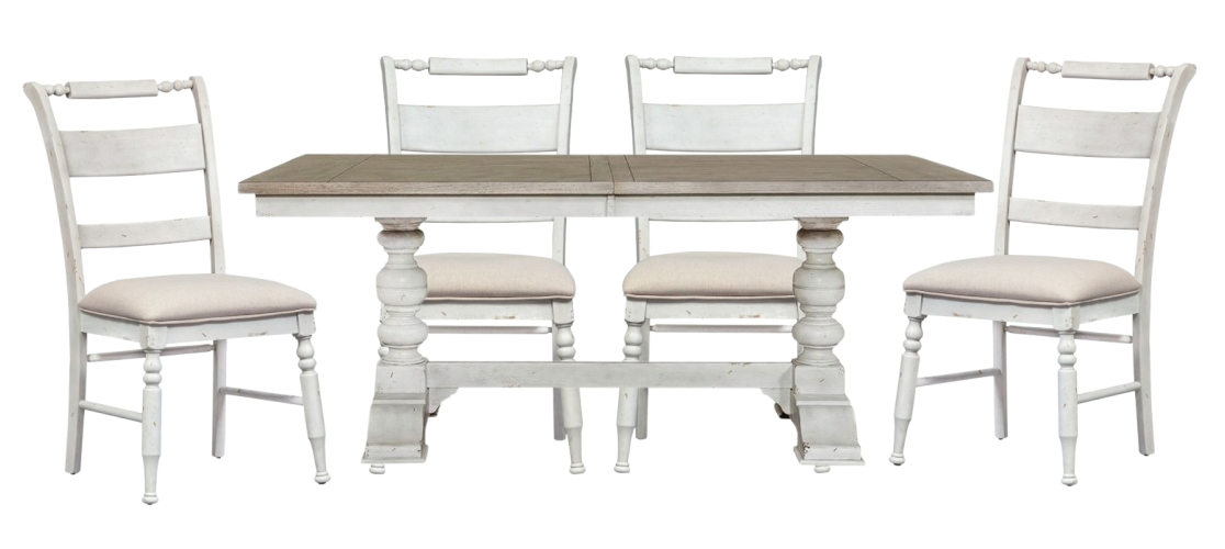 Design possibilities are endless with the Whitney five-piece trestle table set. Crafted of rubberwood solids with oak veneers, this set features an antique linen finish with weathered gray tops and consists of the trestle table and four slat-back side chairs.Read More
