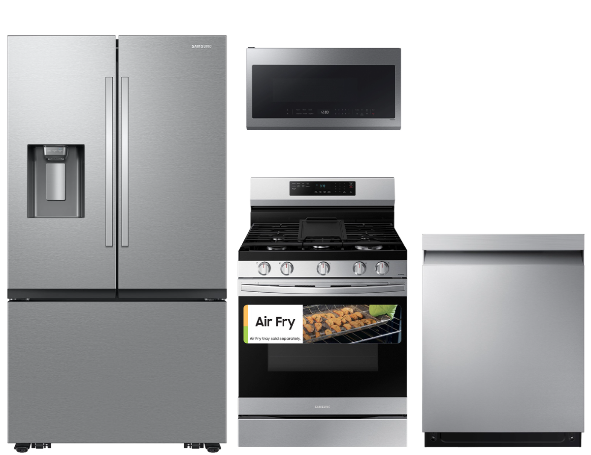 Samsung 4 Piece Fingerprint Resistant Stainless Steel Kitchen Package with French door refrigerator, freestanding gas range with Air Fry, built in dishwasher and over the range microwave.Read More