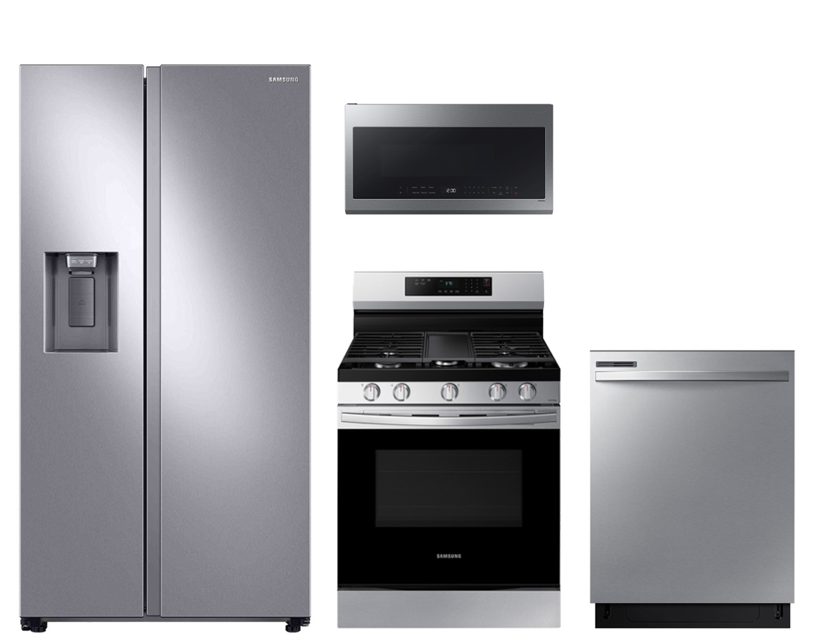 This 4-piece stainless steel kitchen features a 27.4 cubic foot capacity side by side refrigerator with ice and water dispenser, smart gas range with a power boil burner, built-in top control dishwasher with adjustable upper rack, and an over the range microwave.Read More