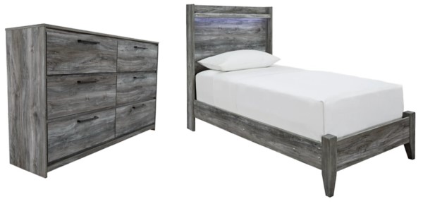 Includes twin panel bed (headboard, footboard, rails) and 6-drawer dresser