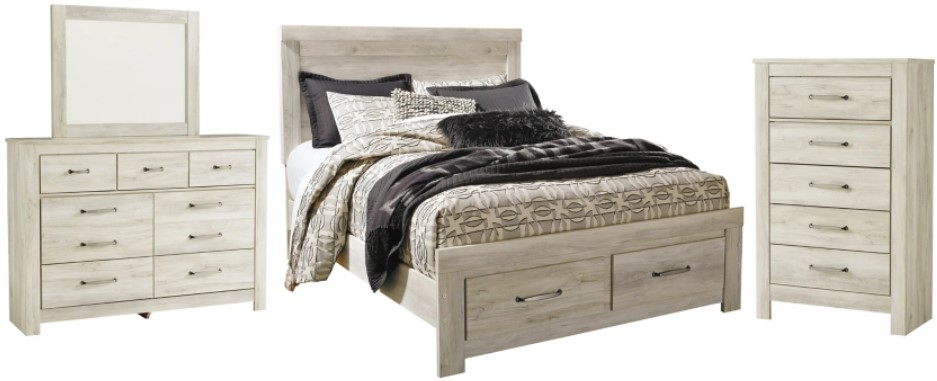 Includes queen storage bed (headboard, footboard with 2 storage drawers, rails and slats), 7-drawer dresser with mirror, and 5-drawer chest