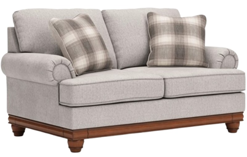 Accent pillows in windowpane plaid infuse a cozy and inviting farmhouse sensibility, while a full wraparound base and decorative turned legs complete the loveseat's timeless look. It's the perfect place to unwind with your bestie after a long day.