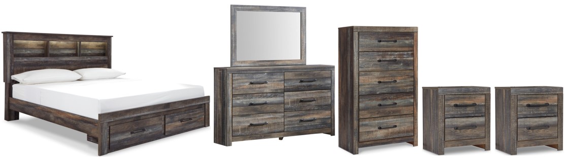 Includes bed (with bookcase headboard, 1-drawer storage footboard and rails), 6-drawer dresser with mirror, 5-drawer chest and two 2-drawer nightstands