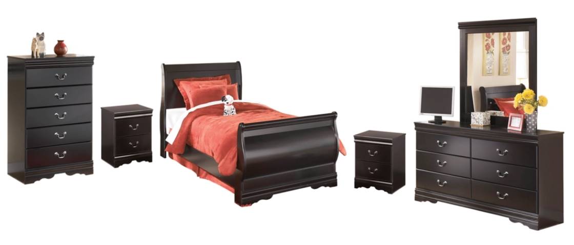 Includes bed (with headboard, footboard and rails), dresser/mirror, 5-drawer chest and two nightstands