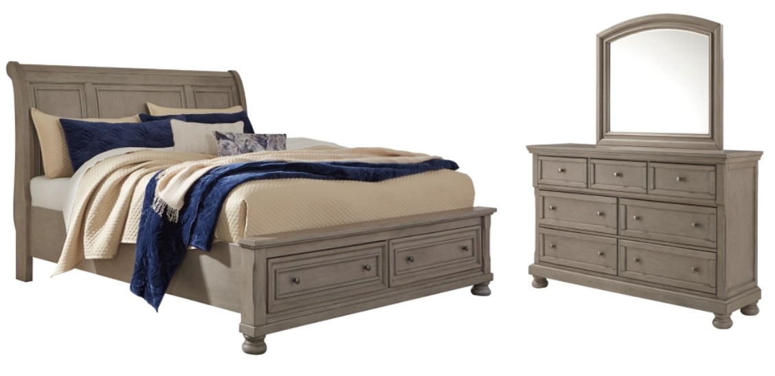 Includes king sleigh headboard, storage footboard, rails with roll slats, dresser and mirror