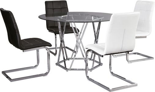 Dig into intimate dinners with the 4 faux-leather upholstered chairs and glass table of the 5-piece Madanere dining set. The contrast of the black and white colored chairs adds a strikingly unique edge to your style.