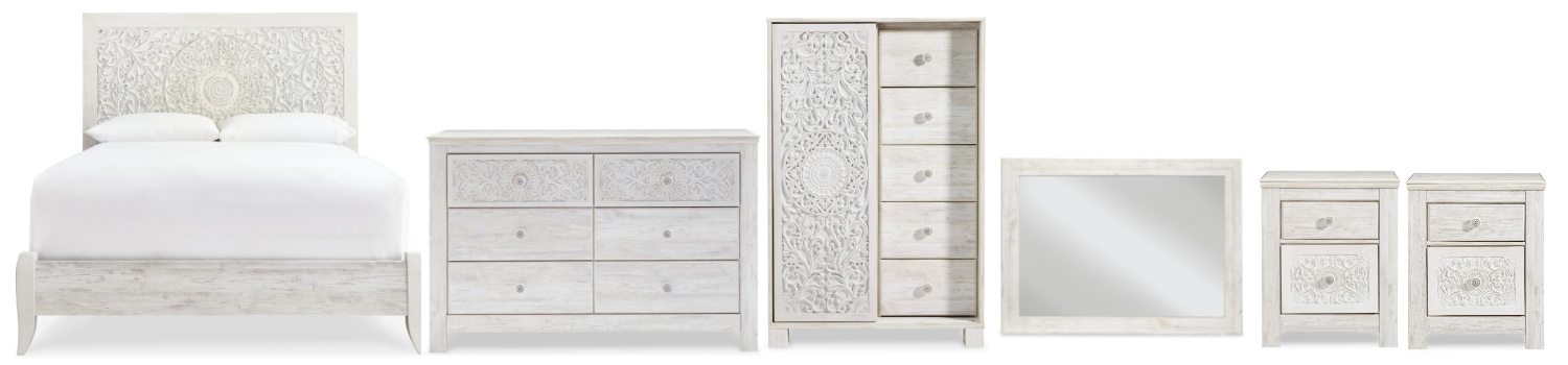 Includes king panel bed (headboard, footboard and rails), 6-drawer dresser, 5-drawer dressing chest, mirror, and two 2-drawer nightstands