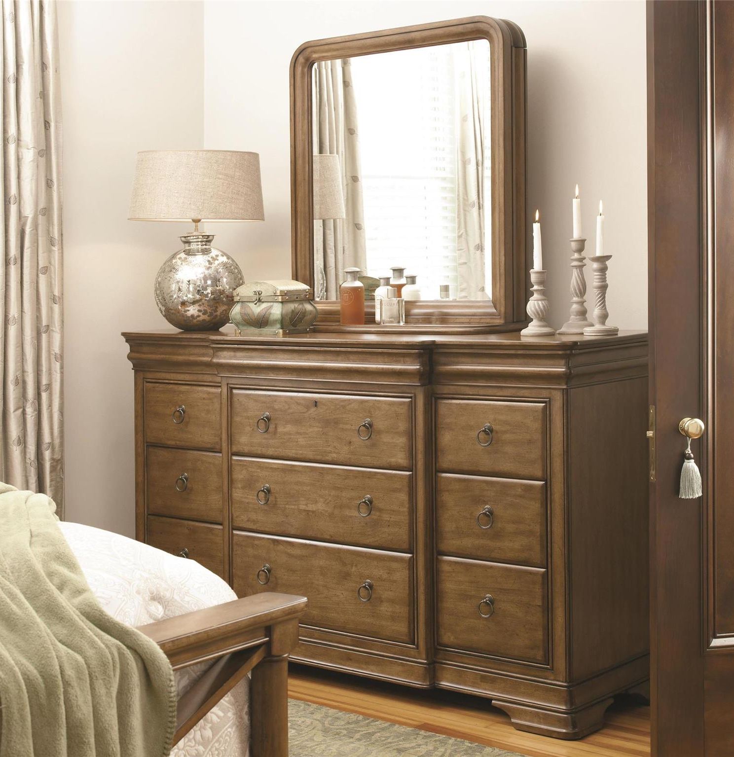 With a focus on the unmistakable beauty and depth of solid wood New Lou dresser and storage mirror from Universal Furniture revives and refreshes time-honored Louis Philippe styling. Arguably the most popular style in traditional furniture during the last 15 years Louis Philippes unadorned classic lines and gentle curves are universally appealing. New Lou borrows the best of Louis Philippe and makes it relevant for today's younger consumers.