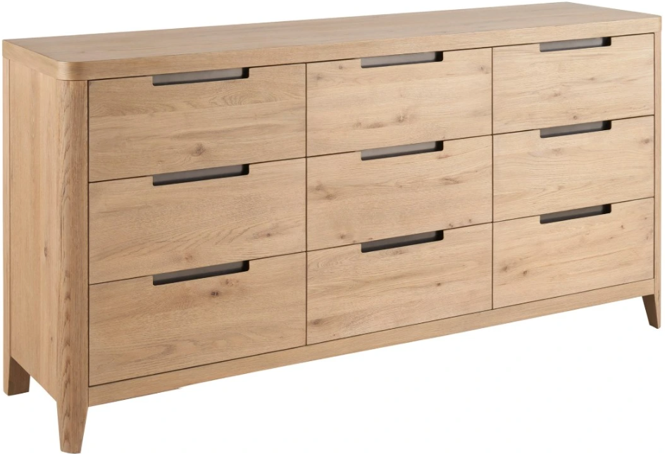 The Walker Drawer Dresser boasts nine drawers and is finished in an organic Natural Oak, offering a versatile and dynamic piece that's as functional as it is aesthetically pleasing. Its natural finish highlights the inherent beauty of the wood, making this dresser a timeless addition to any bedroom.Read More