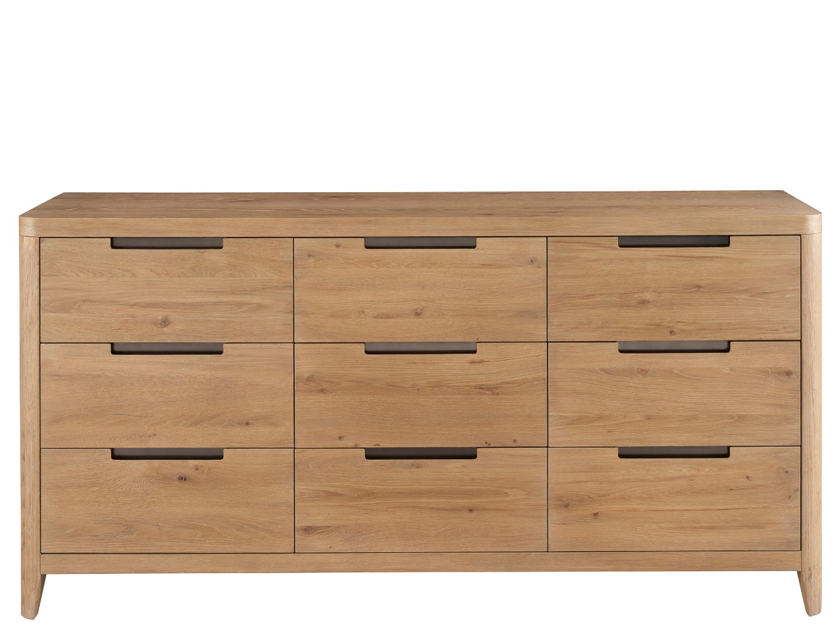 The Walker Drawer Dresser boasts nine drawers and is finished in an organic Natural Oak, offering a versatile and dynamic piece that's as functional as it is aesthetically pleasing.Read More
