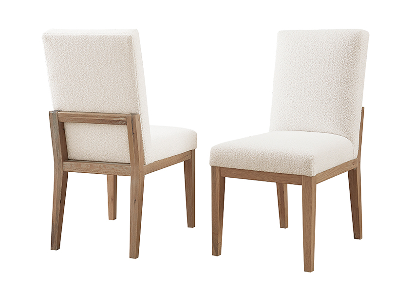 Solid oak and fabric side chair upholstered in a White Boucle Performance Fabric.Read More