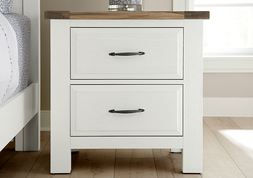 From Vaughan-Bassett's Artisan & Post Collection, the Maple Road collection is made from solid wood with a soft white finish. Crafted from solid maple; this night stand has the perfect mix of timeless style and strength of solid wood to become a beautiful addition to your bedroom for years to come. Available in 3 finishes: Soft White, Maple Syrup, and Antique Amish.Read More
