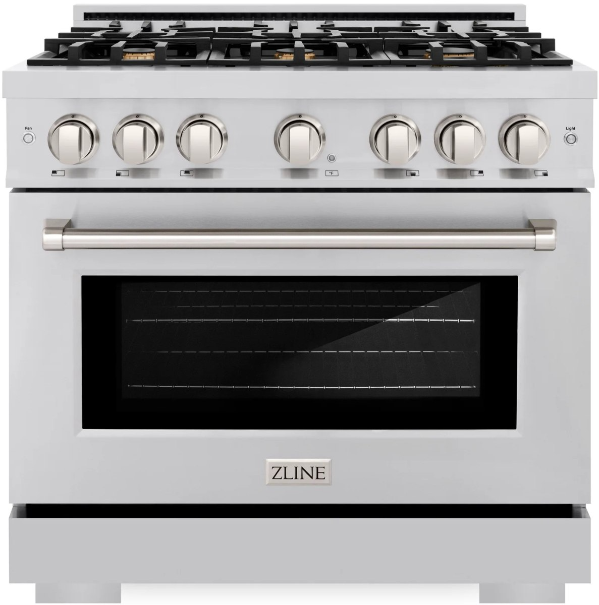 The ZLINE 36 in. 5.2 cu. ft. Select Gas Range with Convection Gas Oven in Stainless Steel with 6 Brass Burners (HGR-BR-36) combines the elegance of a hand-finished porcelain gas cooktop with 6 Italian-made brass auto-reignition burners, a gas convection oven with an energy-efficient cooling fan to ensure quiet operation, and a Horizon oven door window design allowing you to master every meal.